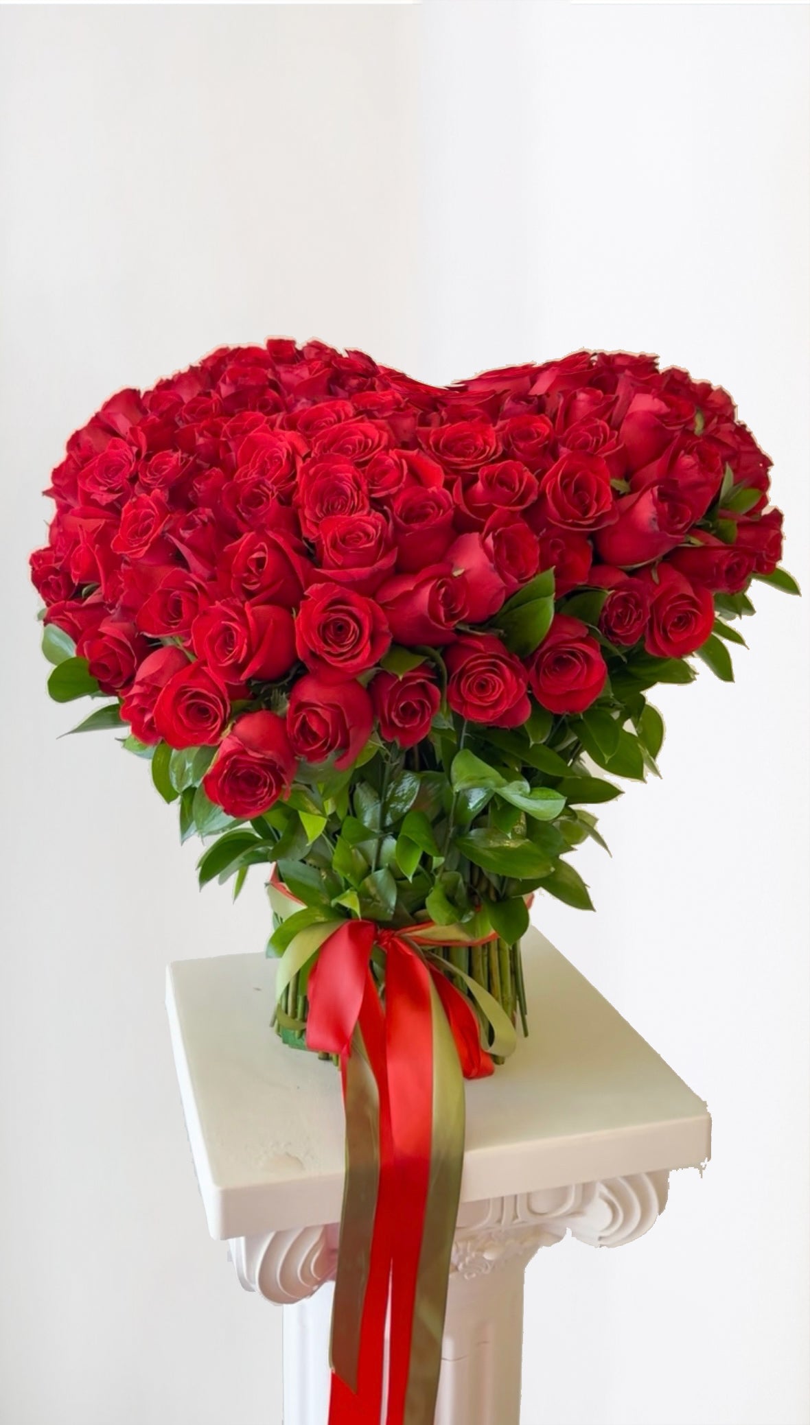 Corazón de rosas rojas, un arreglo floral que celebra el amor con una base propia y fuente de hidratación, perfecto para iluminar y dar vida a cualquier espacio.