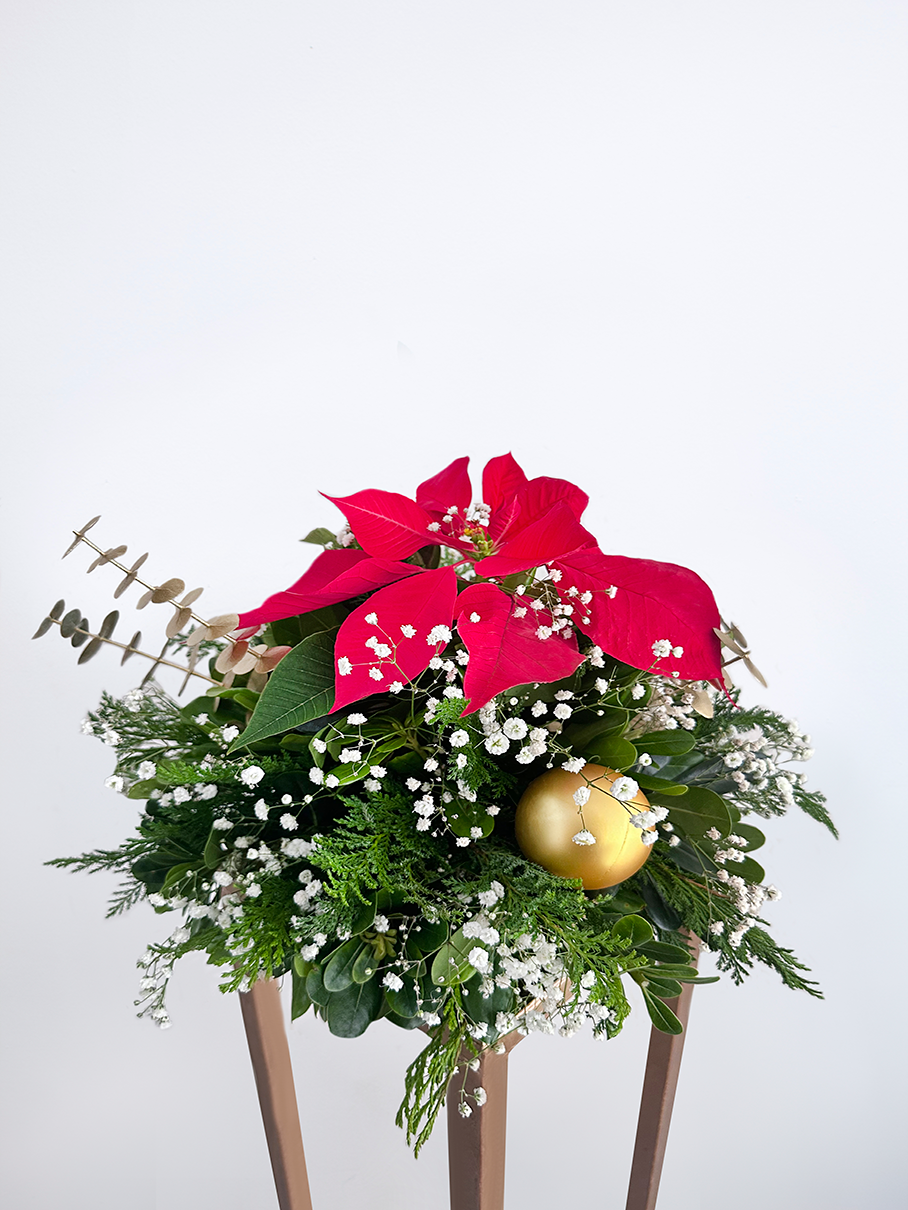Arreglo floral natural 360° para centro de mesa elaborado a base de Nochebuena y follajes varios.